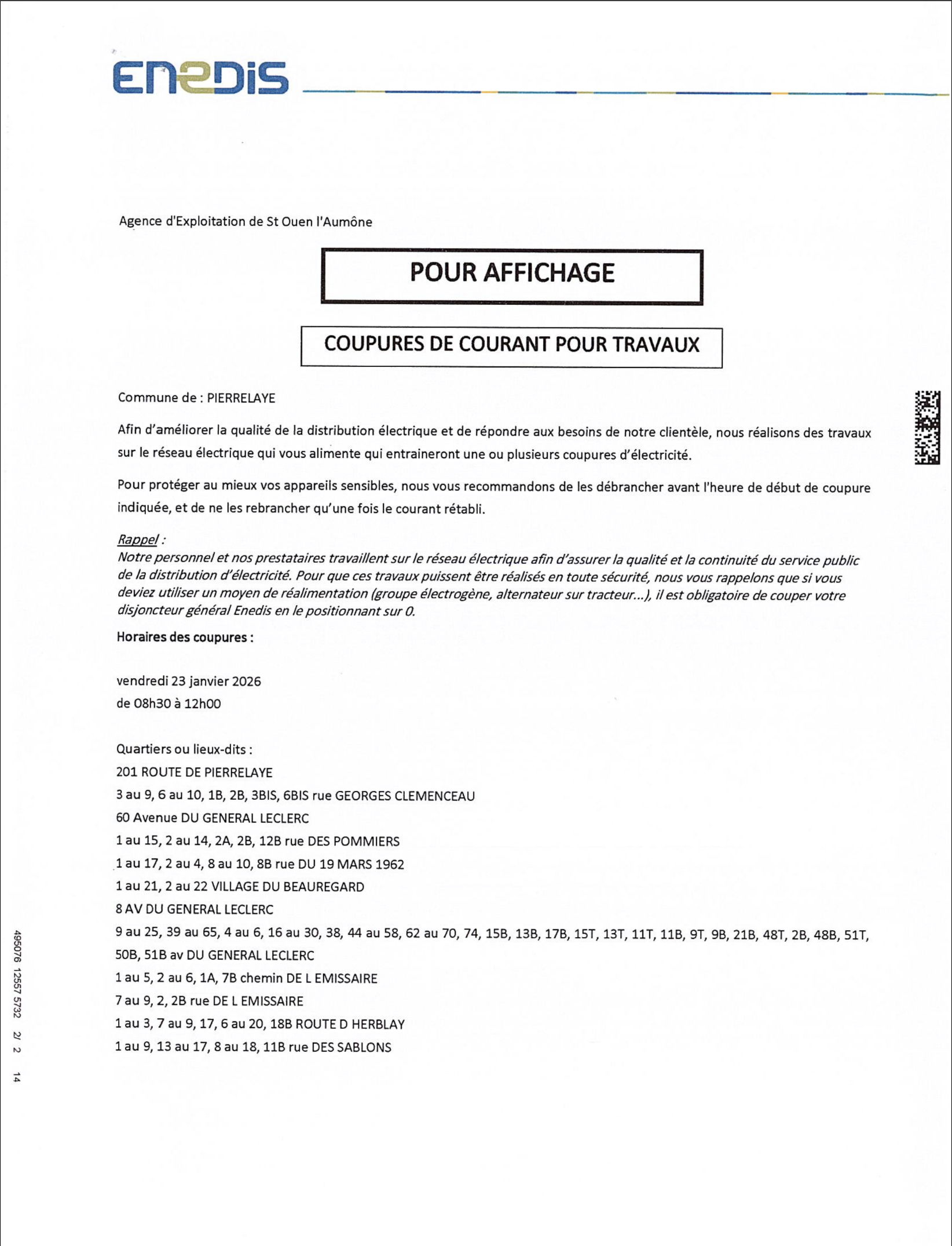 Enedis a prévu de réaliser sur le réseau de distribution des travaux qui entraîneront une ou plusieurs coupures d’électricité le vendredi 23 janvier 2026 de 08h30 à 12h.