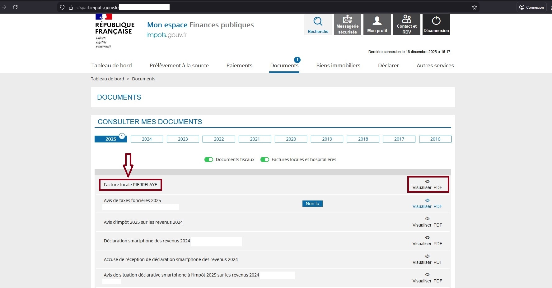 - Ordinateur > [DGFIPseconnecter]2 /[DGFIPfacture]3 avec l’onglet « Facture locale PIERRELAYE » à Visualiser PDF.